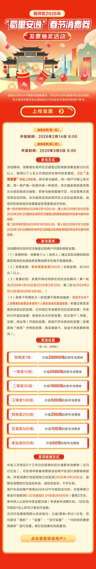 单张满300元的税务发票即可参与抽奖,奖池为50万元。(发票抽奖界面扫码直达,2月9日可上传发票)