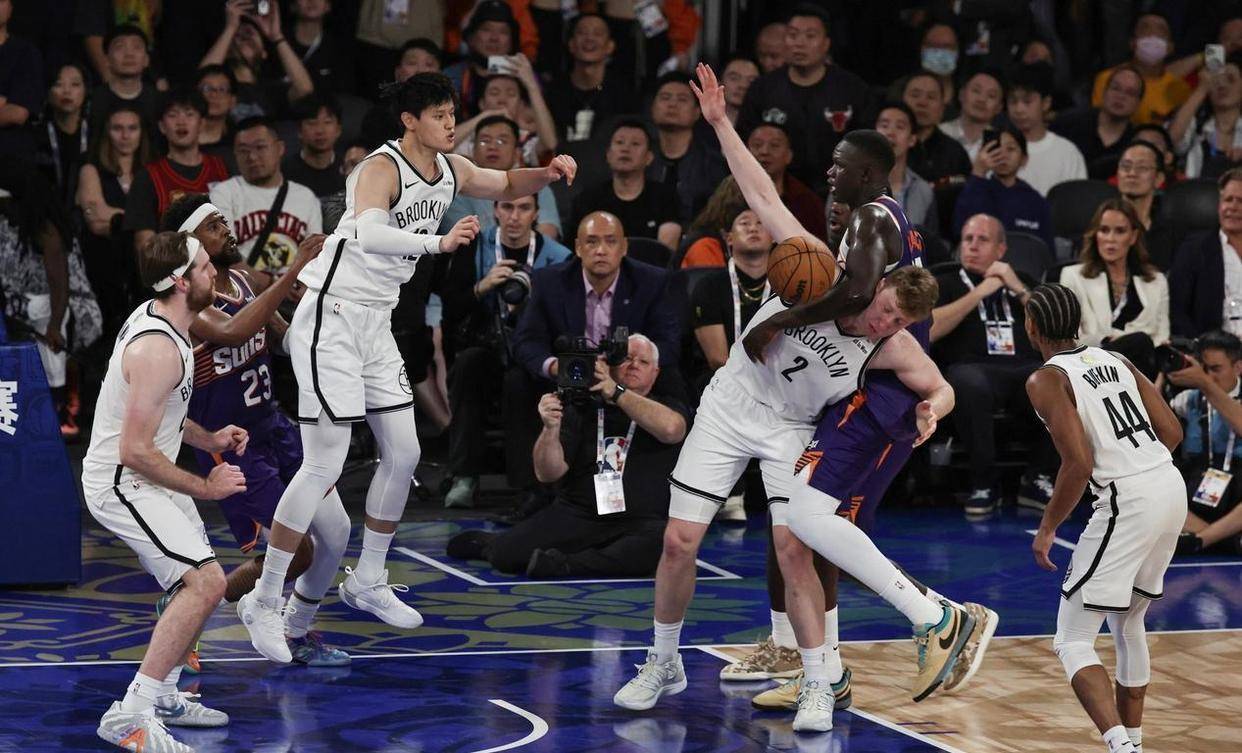首秀之夜最令人扼腕的瞬间发生在比赛的第二节。 曾凡博被布置换防太阳队的明星球员布克。 他张开臂膀,试图用长臂限制对手的突破,但布克一个狡猾的假动作便轻松晃开了他,裁判随即响哨,吹罚犯规。 不到两分钟后,同样的戏码再次上演:曾凡博在补防过程中动作幅度过大,导致对手摔倒,领到了他的第三次犯规。 板凳席上的篮网队友们只能无奈地摇头。