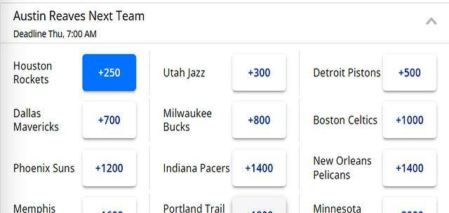 现在最让湖人球迷睡不着觉的,就是火箭队虎视眈眈地盯着里夫斯。最新的赔率显示,如果里夫斯真要走人,火箭是最有可能的下家,赔率 250。紧随其后的是爵士、活塞、独行侠这些球队。