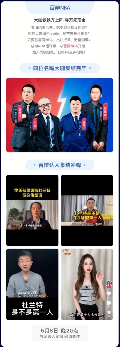 据悉,5月8日晚20点,《百辩NBA》将直播导师分组选人,24强入围选手摩拳擦掌,四位大咖导师将如何排兵布阵也让众多网友期待不已。
