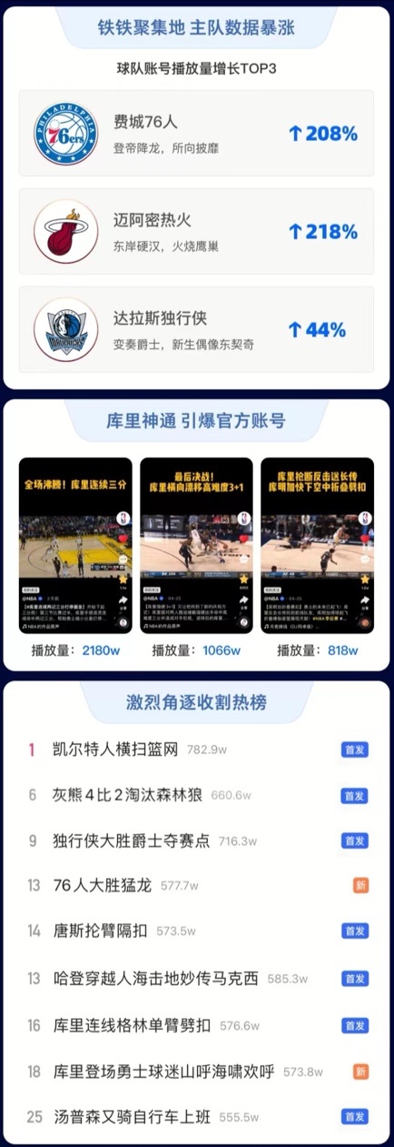 本届NBA季后赛首轮爆点不断,库里手感滚烫让场上下起“三分雨”,带勇士成功闯进西部半决赛,相应的,库里的精彩视频也成为快手上NBA账号播放量前三的爆款。另外,#凯尔特人横扫篮网#、#灰熊4比2淘汰森林狼#、#独行侠大胜爵士夺赛点#等实时战况则不断收割热榜,广大网友在快手将赛事热点尽收眼底。同时,快手用户高涨的观赛热情也带动各主队关注度大增,“费城76人”、“迈阿密热火”、“达拉斯独行侠”成为播放量增长TOP3球队账号。