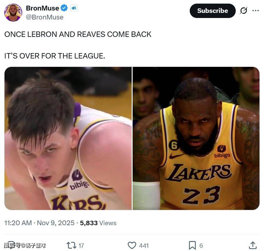 湖人自媒体BronMuse也在赛后发布了一张詹姆斯与里夫斯互相对视的照片,并配文:“一旦这两人回归,联盟就将迎来大结局。”
