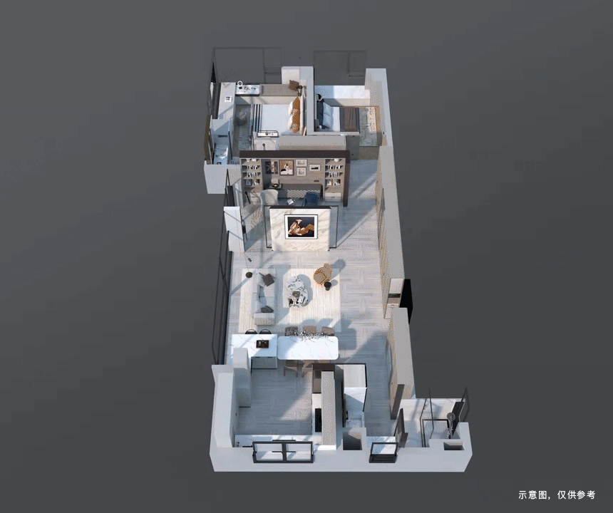 超过60平米的开放式空间(客厅、餐厅、X空间、阳台一体化),功能灵活,可满足大型派对或家庭休闲,尺度感直接媲美原来350㎡的滨江户型。