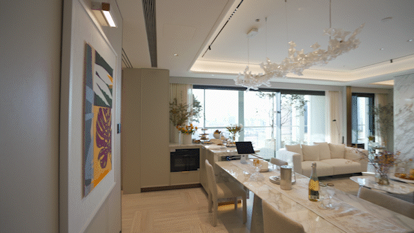 设计背书由问鼎国际大奖的著名设计师吴滨操刀,延续其“汤臣一品5亿顶复”的“摩登东方”理念。以黄浦江为灵感,营造“阅尽千帆后的宁静与松弛感”。通过8.5米南向宽厅、270°环幕玻璃、无冗余装饰的减法美学,让空间如江面般舒展,视野极度开阔。