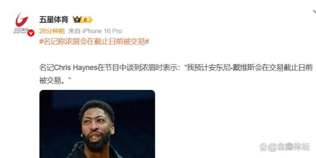 于是,流言在联盟里炸开了锅。 NBA权威记者克里斯-海恩斯扔下了一颗重磅炸弹:独行侠计划在交易截止日前送走浓眉。 这个消息源的可信度极高,因为海恩斯是如今 Woj 退休、Shams 称王时代里,最被认可的几位记者之一。 他说的话,基本就代表了事情正在发生。 交易截止日是2月5日,满打满算,也就剩下一个月时间。 一时间,全联盟的经理们电话都快打爆了。 老鹰、勇士等名字被反复提及,大家都在盘算,用什么样的筹码,才能换来这位能改变格局的超级内线,同时又得掂量他那份顶薪合同和脆弱的身体。 达拉斯的训练馆里,气氛变得微妙,每个人都清楚,一场地震级的变动,即将来临。