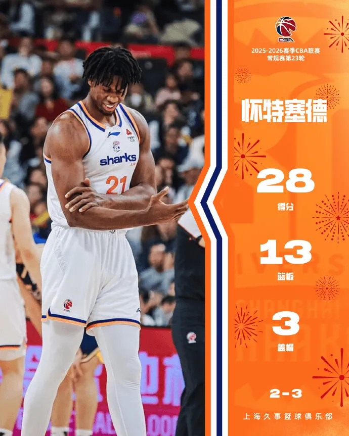 上海球员怀特塞德出战24分钟,投篮17中13砍下28分13篮板2抢断3盖帽。