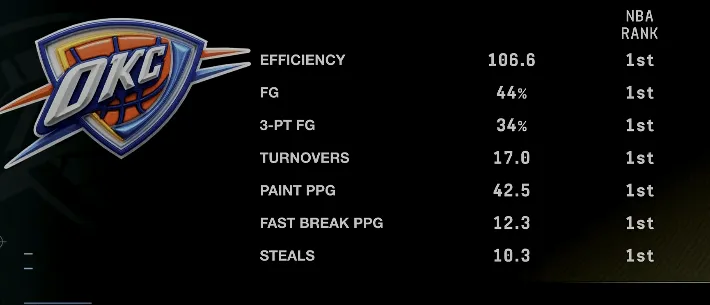 比赛的第二节,转播画面给出了一组关于上赛季常规赛,雷霆防守端表现的数据,详细内容如下: