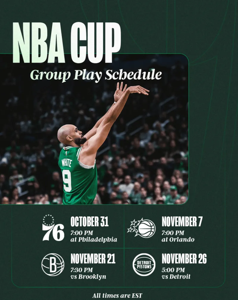 虎扑08月14日讯 凯尔特人今日官方公布了球队2025-26赛季NBA杯赛的赛程,凯尔特人所在小组对手分别为76人、魔术、篮网和活塞,具体赛程如下(北京时间):