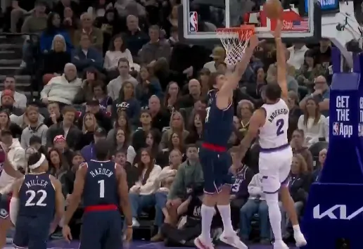 第一节比赛中,李凯尔转身过掉哈登迎着大洛抛投打进,爵士26-17领先快船。