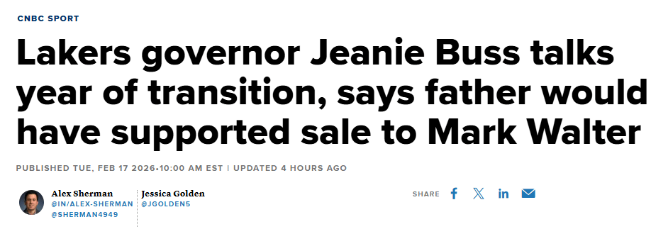 珍妮及其家族去年同意以100亿美元的估值,将湖人队多数股权出售给沃尔特。ESPN近期报道称,巴斯家族兄妹间的严重分歧最终促成了这笔交易,珍妮称这次出售“苦乐参半”。
